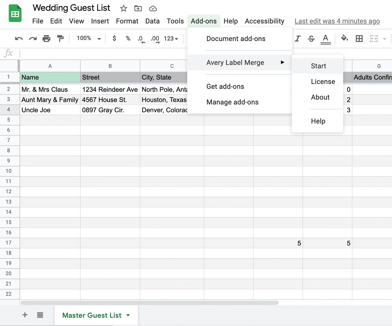 How to Print Labels on Google Sheets (with Pictures) - wikiHow Create the Labels Download Article 1 Go to in a web browser. If prompted to sign in to your Google account, sign in now. 2 Click +. It's at the top-left corner of the page. This creates a blank document. 3 Click Add-ons. It's in the menu bar at the top of the document. 4 Click Avery Label Merge. 5 Click New Merge. 6 How to Mail Merge Avery Labels using Google Docs & Google Sheets 2) Open Google Sheets. In the "Add-ons" menu select "Labelmaker" then "Create Labels" 3) Select the spreadsheet that contains the data to merge. The first row must contain column names which will... How to print mailing labels from Google Sheets? - YouTube Learn how to print labels for a mailing list in Google Sheets & Google Docs.You'll learn how to create labels from a demo mailing list, using merge fields su... How to Print Labels from Google Sheets in Minutes To make labels from Google Sheets, follow these steps: 1) Prepare Document 2) Install Labelmaker 4) Choose Template 3) Open Labelmaker 5) Format label 6) Create Labels & Open Document 7) Print your Labels 1. Prepare your Document Open your spreadsheet which contains the data you want to print.