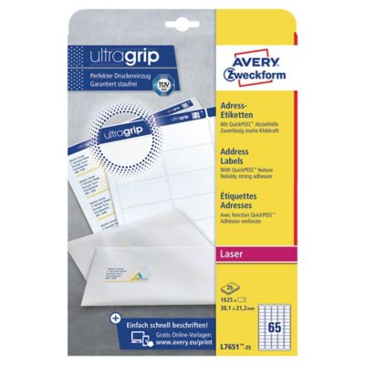 Avery L7651-100 Labels, 38.1 x 21.2 mm 65 Labels Per Sheet, 6500 ... Avery L7651-100 Labels, 38.1 x 21.2 mm 65 Labels Per Sheet, 6500 Labels Per Pack · UltraGrip 3D diamond shaped microdot pattern on the blue bars, at the top and ... Avery 65UP Laser Mini Address Labels White 25 Sheets - Officeworks There are 65 labels per page, with 25 sheets in this pack. There are 1,625 labels in this pack. These labels are white. Quick Pop-up Edges will allow you to ...