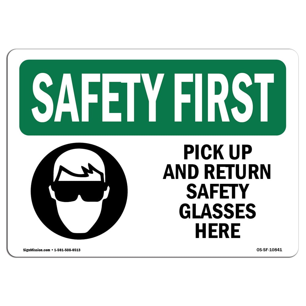OSHA SAFETY FIRST Sign - Pick Up And Return Safety Glasses Here | Decal | Protect Your Business, Work Site, Warehouse & Shop Area | Made in the USA